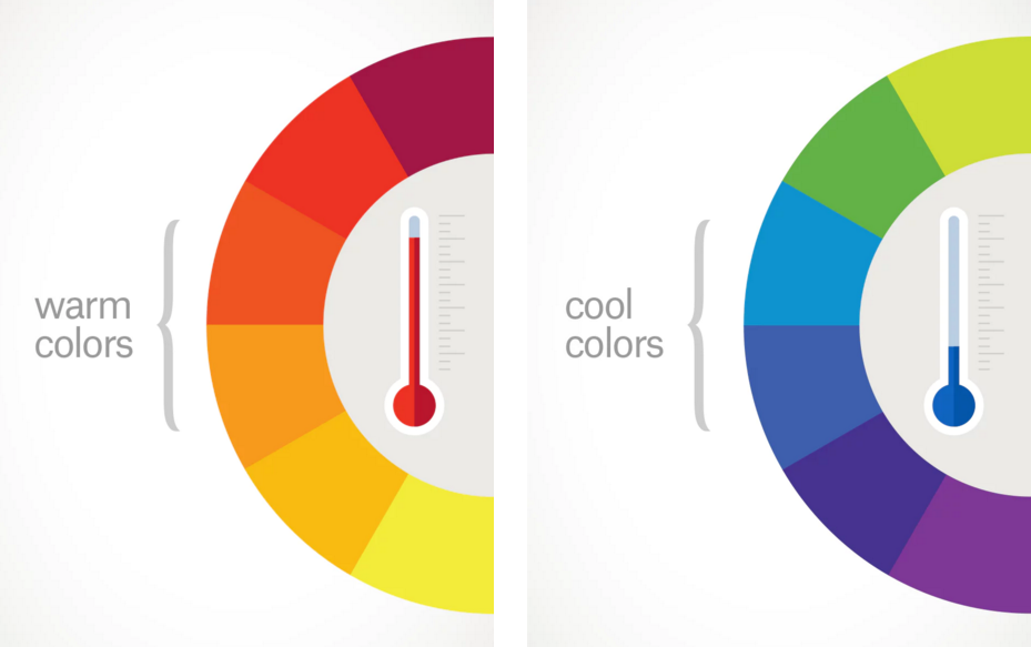 - مجموعة الألوان الساخنة Warm colors : عادة ما ترتبط الألوان الساخنة بالطاقة والتوهج والعمل وهي ألوان الأحمر ، البرتقالي والأصفر.